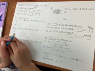 面積の学習のまとめ。プリントの練習問題に取り組んでいました。