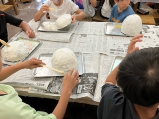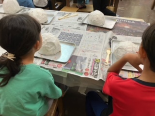 学芸会で使う被り物を作っていました。これから絵の具で色を塗るようです。