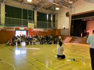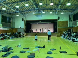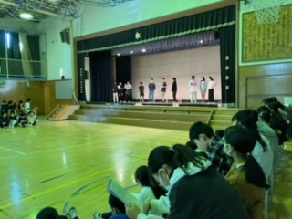 体育館での練習が始まりました。舞台をどう使うか、ひな壇にいる人はどう参加するか、一つ一つ確認しながらです。