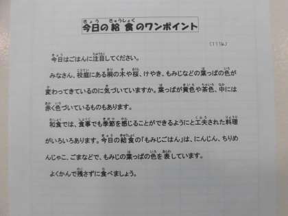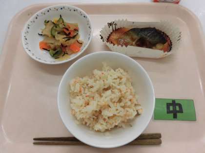 【献立】もみじごはん・魚のみそマヨネーズ焼き・大根とひじきのサラダ・牛乳