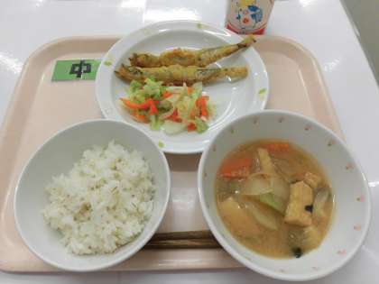 【献立】麦ごはん・焼きししゃも・野菜のひとしお・生揚げのみそ汁・牛乳