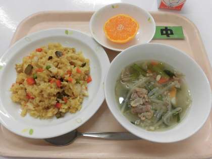 【献立】カレーピラフ・ベーコンと野菜のスープ・みかん・牛乳