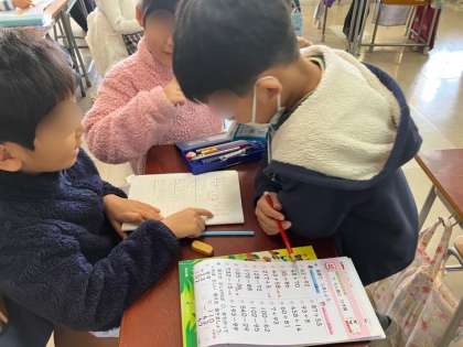 ?足し算の筆算の練習問題を終えて、お互いに確認したり、教えあったりしていました。