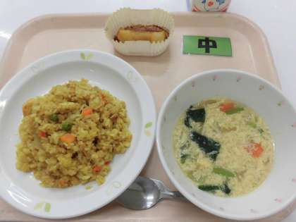 【献立】ツナピラフ・チーズのふわふわスープ・焼きりんご・牛乳