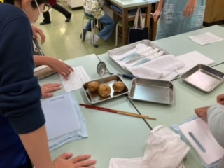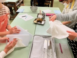 今日は調理実習で粉吹き芋を作ります。じゃがいもを洗ったり、お鍋を用意したり、グループで分担して準備をしていました。