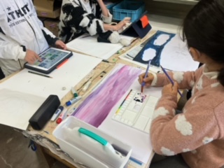 5年生は、「瑠璃色の地球」の歌の中から自分で場面を切り抜いて絵画にしていました。