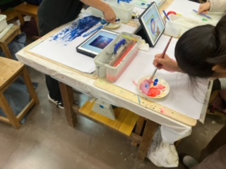 水彩絵の具を混ぜ合わせながら、きれいな色を作り出して、背景を塗っていました。