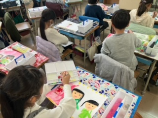 学芸会の絵を描いていました。雨の中、遠足に行っちゃって、そこでカミナリの子と出会った2年生。描いているのも、みんな楽しげな雰囲気です。