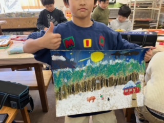 この一枚の作品の中には、図工で習った手法がいろいろと使われています。まるで、絵本の中に出てきそうな素敵な作品です。