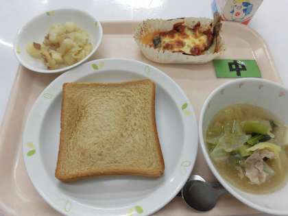 【献立】黒砂糖パン・魚のピザ風・ジャーマンポテト・キャベツのスープ・牛乳