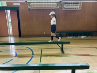 体育館では、2年生がフラフープや平均台でうまく体を操作する運動をしていました。