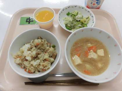 【献立】とりめし・みそ汁・ゆかり和え・みかんゼリー・牛乳