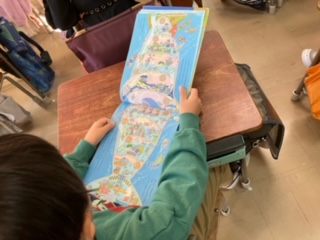それぞれ、自分の席で本を読んでいました。縦長の本や迷路の本、仕掛け絵本など、楽しい本がたくさん。子どもたちは、それぞれに好みの本があるようです。