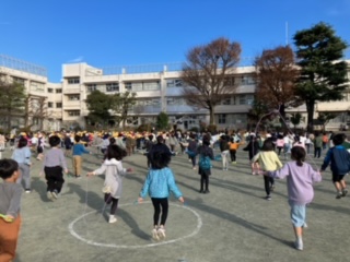 今日は1〜3年生のなわとび朝会でした。音楽に合わせてなわとびをしました。真っ青な青空。気持ちの良い朝。1日の始まりです。
