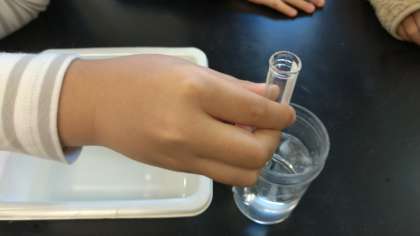空気の体積と温度の変化の関係を調べました。石けん水で膜を張り、体積の様子を観察します。