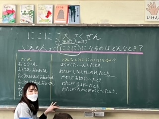 にこにこ大作戦の話し合いをしていました。家の人がニコニコになるのは、どんな時かな?みんなでそんな場面を出し合っていました。