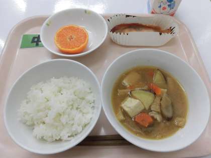 【献立】ごはん・さかなの西京焼き・さつま汁・菊花みかん・牛乳