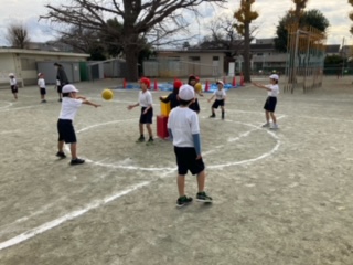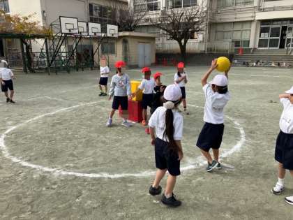 今日は冬らしい天気で、かなり冷え込みました。でも、校庭で元気にボールゲームをして楽しむ1年生。投げるのも、的を守るのも必死です。