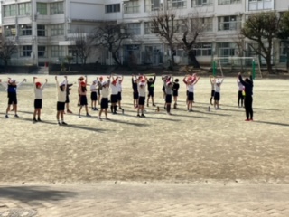 冬らしい天気で、晴れていても空気の冷たい校庭。4年生が縄跳びをしていました。よーく体を伸ばし、ストレッチをしています。