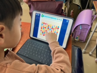 100までの大きな数を数えるお勉強。iPadを使って、十のまとまりに分けながら、とても効率よく数えることができていました。