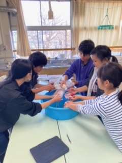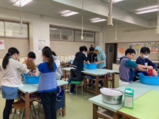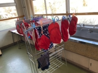 衣服の手入れについて学習し、手洗い洗濯の実習をしました。帽子やタオル、ハンカチなどを洗いました。