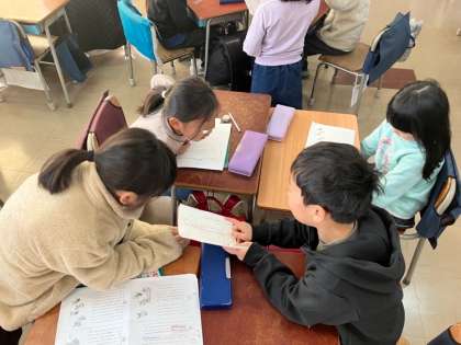説明文の学習で、全体の文章から問いの答えとなる段落を見つけ出す活動をしていました。グループで意見を出し合いながら、考えをまとめています。