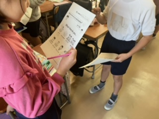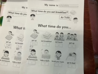 英語で会話をするアクティビティ。what time do you...?の質問を受けて、自分の一日の中でする事を伝える、というアクティビティです。