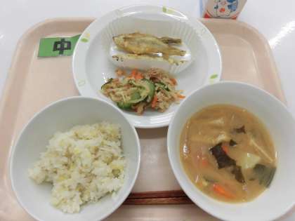 【献立】雑穀ごはん・わかさぎの天ぷら・切干大根のサラダ・みそ汁・牛乳
