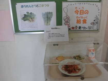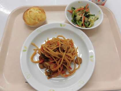 【献立】スパゲティーナポリタン・ほうれん草のサラダ・ミルクマフィン・牛乳