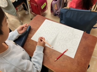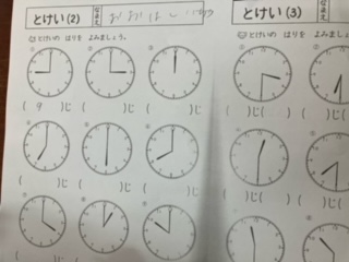 時計の学習です。まだピッタリの時刻と30分の時刻だけですが、すっかりデジタル時計の表示に慣れている子たちは、アナログ時計の読み方に四苦八苦です。