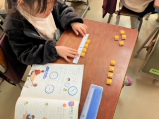 12個のブロックを使って、2つずつ、3つずつ、4つずつ…と、いろいろな分け方をしていました。