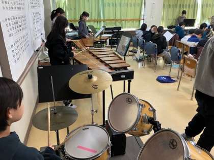 ?六年生を送る会で披露する合奏曲の練習に励んでいます。難しい曲で、それぞれの楽器担当ごとに練習を積んでいます。