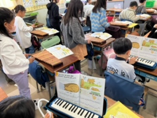 木琴とキーボードと鍵盤ハーモニカの3つの学活で合奏をしていました。