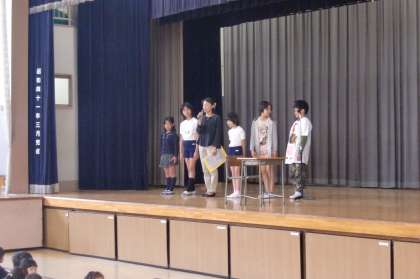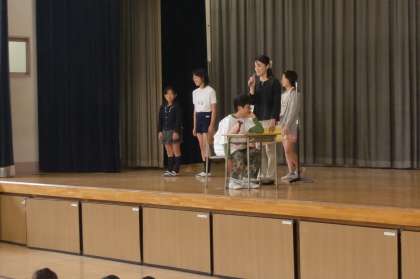 今日の全校朝会は、杉谷先生と保健委員会による保健朝会でした。「姿勢を正しくしよう」という目標で、前は立体の内臓、後ろは背骨の様子が描いてあるTシャツを着た保健委員の6年生が、勉強する時の座り方の見本をしてくれました。いい姿勢で座ると内臓が圧迫されず、背骨もしっかり伸びている様子がわかりました。逆に悪い姿勢でいると内臓が圧迫され、背骨も曲がった状態であることもわかりました。