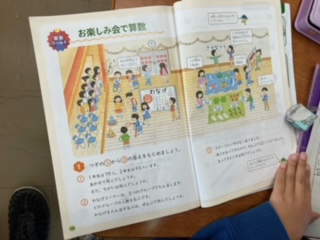 2年生も、年間のまとめの内容の学習です。教科書の絵に、お楽しみ会の様子が描かれていて、そこに算数的な問題がたくさん含まれています。