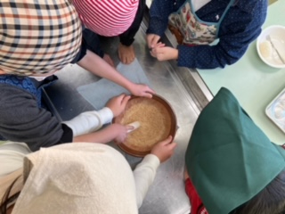 すりこぎで、じっくりと大豆を粉にして、餅米を丸めて、あとは美味しくいただきます!