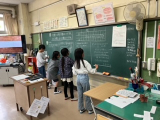 自分の考えを黒板に書いて、それを発表します。答えを求めるだけでなく、その考え方をしっかりと人に伝えることが大事ですね。