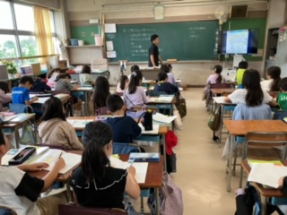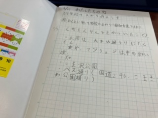 連休前に行った学区域内のまち探検について、教室でまとめを行っていました。地図を見ながら、自分たちが回ったコースを確認していました。