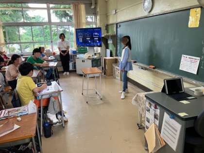 ?英語で自己紹介をしていました。出身地や得意なこと、好きなものなど、上手に英語でスピーチができていました。