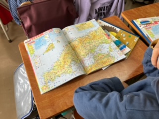 地図帳の見方を学んでいました。日本全国、各地の特産品も地図帳で知ることができるのです。