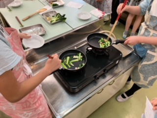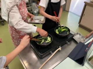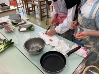 調理実習。ごま油を使う、ニンニクを使う、ソーセージを使う…。それぞれにひと工夫ある炒め物ができそうです。