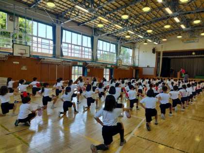 今週から運動会練習が始まりました。3年生は今年もフラッグを行います。体育館で動きを覚えているところです。