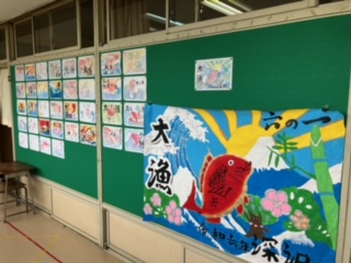 ソーラン節の大漁旗。それぞれで描いたイラストから選ばれた一枚が、クラスの大漁旗として制作されました。廊下に飾られています♪