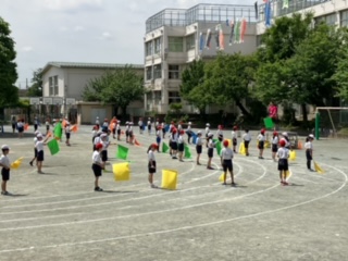 運動会の踊りは、カラフルの旗を持って踊ります。今日は、校庭で隊形移動しての練習でした。