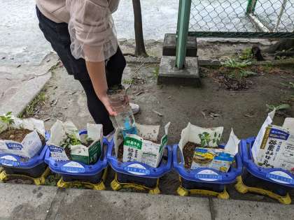 2年生がミニトマトの苗を自分の鉢植えに植えました。大きく育つように水やりなどのお世話を毎日行います。自分で育てたミニトマトの味は格別です。