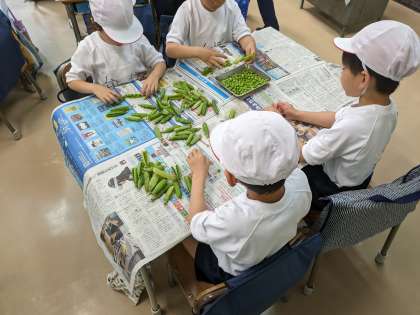 今日の給食で使うグリンピースの皮を1年生をむいてくれました。自分たちが関わった給食の味はいつもよりも、もっとおいしく感じられることと思います。