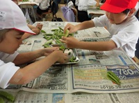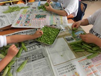 今日の給食は「グリンピースごはん」でした。さやから豆を出すお仕事を1年生にお願いしました。その様子をご紹介します。