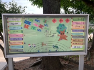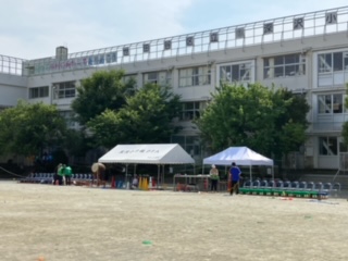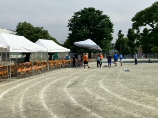 子供たちを帰して、先生たち全員で明日の運動会の準備です。ラインを引いて、テントを立てて、椅子を並べて、放送機材をセットして…。