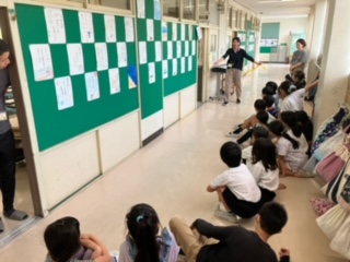 巻き尺で1メートルより長い長さをはかる学習。いろいろな先生の立ち幅跳びの長さをはかって練習しました。