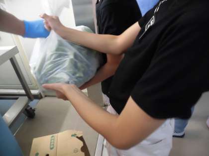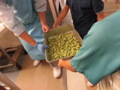 さやをむいた豆と、むいた後のさやを給食室に運びました。重くて大変そうでしたが、調理師さんに「お願いします」と言いながら渡しました。